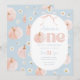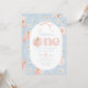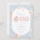 One cute pumpkin! Floral pumpkin and bow Themed girl's 1st Birthday Invitation featuring blue and pink background with daisies, pumpkin and cute pink bow.