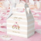A cute, sweet and stylish personalized favour box for a girl baby 1st birthday party, with a pink pumpkin theme, perfect for Halloween or the fall, the harvest etc. It features a watercolor painting of a pink pumpkin with a pink bow, and pink roses, as well as a few fall leaves.