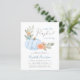 A cute budget-friendly baby boy sprinkle invitation with "a sweet little pumpkin is on his way" written in blue typography and a soft grey script with a heart swash, and a watercolor bouquet of a pastel blue pumpkin, orange florals and greenery. Easily personalize the mother's name in a modern blue script and the spinkle details in simple soft grey typography.