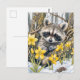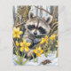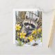 Cute drawing of a small raccoon sitting between tree trunks in spring, with daffodils blooming nearby.