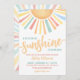 Celebrate the upcoming arrival with a bright and cheerful sun themed baby shower invitation. At the top, a big sun with vibrant rays in yellow, orange, red, teal, and blue beams down, setting the tone for a joyful celebration. The phrase "A little ray of sunshine is on its way!" is displayed in a mix of modern fonts and bold script typography, adding a playful touch. The bottom of the invitation includes all the event details, styled in a combination of font styles and colours—orange, red, and teal blue—that match the sun's rays. On the back, a larger version of the colourful sun shines brightly. If you prefer a more powerful, vivid look, simply remove the transparent white layer in the editor to enhance the sun's colours. This gender-neutral design is perfect for celebrating the mother-to-be and welcoming a new little ray of sunshine into the world. A bit of a mix of boho, retro, and modern. A Little Ray Of Sunshine Is On The Way Gender Neutral Baby Shower Invitation Colourful Cute Watercolor.