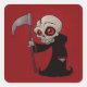 Vector cartoon illustration of a little Grim Reaper with red eyes holding a scythe.