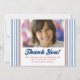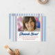The perfect photo thank you note for your little All Star on their birthday! Customize with a photo and mesage. Features blue and white pinstripes, red and blue text, and red baseball stitching.