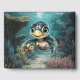 Little sea turtle exploring with her friend. Her big, bright eyes are full of curiosity and expressiveness, making her super adorable. Her head is bright yellow and round, giving her a cheerful and warm face. With a loving smile, she swims directly toward the viewer. The whole thing seems like a happy, magical underwater world full of friendship and adventure.