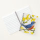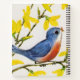 This spiral notebook is white with a little singing blue and red bird sitting on a branch in a tree with bright pretty yellow flowers on the front and back.