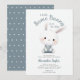 An enchanting watercolor illustration featuring a precious bunny boy wearing overalls decorates this delicate baby boy shower invitation with a dusty blue and white colour scheme, that is a perfect fit for a springtime celebration, Easter events, a summer garden fête, or a charming picnic-themed baby shower.