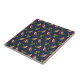 The original pattern on this small Ceramic Tile is original illustrations by ZoeSPEAK of little song birds. The birds are facing each other, as if they are singing, against a deep marine blue background dotted with tiny yellow stars. There are vertical rows of twirled red ribbons, with groups of green leaves between the little brown birds.