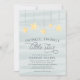 Our sweet starry baby shower invitation features a string of hanging stars in pale yellow watercolor on a gender neutral ice blue watercolor wash background. "Twinkle, twinkle little star" appears beneath in smoky navy blue block and script lettering. Personalize with your baby shower invitation wording using the template fields provided.