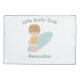 Cute little surfer boy with a surfboard personalized pillowcase. "Little Surfer Dude" Personalize with name, initials, message or any quote you desire. A baby blanket is also available in this theme and design.