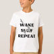 This children’s T-shirt features a dynamic graphic design of a person wake surfing, with a stylized wave below and a bird flying overhead. The words “WAKE SURF REPEAT” are prominently displayed above and below the surfer in bold, capital letters. This design captures the thrill and excitement of wake surfing, making it a perfect choice for young water sports enthusiasts.