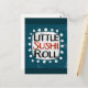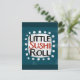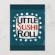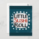 A cute typographic food design that says "Little Sushi Roll". It's black and red text on a white rectangle with funky, playful white dots surrounding it, all on a teal background.