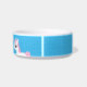 A pet bowl featuring an adorable vector illustration of a white Unicorn with a flowing pink mane on a blue background.
