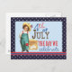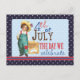 A boy in overalls stands next to a box of fireworks as vintage illustration. Marrying fun vintage and modern designs with a navy blue background with white little stars. Very patriotic, full of colours and charm. Written "4th of July, the day we celebrate"