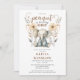 A sweet little illustrated baby elephant cub watercolor soft pastel 1st birthday party invitation, with earthy rustic cream and brown hues and florals. Gender neutral for boy or girl. A pretty earthy style with a lovely rhythmic flow of type and image.