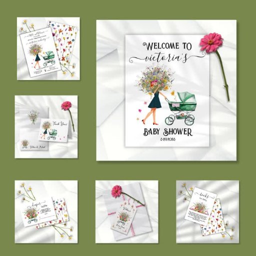 "A little wildflower" Baby shower. Great for a garden, outdoor, or boho feel! Features a baby had holding a wildflower in a stroller. Gender neutral with Flowers in muted bright pastel colours. All wording can be changed! Great for a garden, farmers market, wildflower or picnic baby shower. To make more changes go to Personalize this template. On the bottom you’ll see “Want to customize this design even further? Click on the EDIT using Design tool.