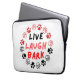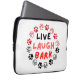 This design features a circular design with the words "Live Laugh Bark" written in bold, colourful letters. Surrounding the words are paw prints in alternating red and black. The paw prints create a frame around the text, adding a playful and whimsical touch to the design. The overall image is cheerful and positive, suggesting a love for dogs and a carefree attitude towards life. This design would be perfect for dog lovers.