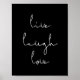 Live laugh love, mots inspirants pour cette affiche noire minimaliste.
