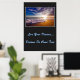 Poster shown with a photo print of a beautiful beach sunset. Poster background is a deep charcoal colour.