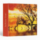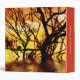 silhouette of tree branches submerged in water and a lone bird sittin on the branches against an orange sunset sky..