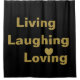 Inspirational “Living, Laughing and Loving” black and gold shower curtain. The black background colour can be changed by the customer.