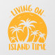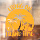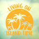Vector illustration of a tropical sunset and palm trees on a small vacation island paradise with Living On Island Time text. Keywords: beach, caribbean, cartoon, illustration, island, isle, palm, palmtree, paradise, sea, season, silhouette, summer, sun, sunrise, sunset, tree, tropic, tropical, vacation, vector, palms, time