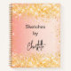 Arrière - plan orange et or. Décoré de confettis. Personnalisez et ajoutez un nom, The title : sketchbook écrit avec un script de style à la main moderne girly, style signature. Lettres de couleur noire. Un carnet pour les dessins, esquisses, notes et devoirs scolaires.