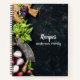 Un carnet de livre de cuisine pour vos recettes familiales préférées. Nourriture fraîche, herbes, oignons de basilic, découpe en bois Conseil d'administration d'une herboristerie sur une toile rustique foncée d'un peintre avec des taches de peinture. Modèle pour votre texte et nom de famille. Un classeur correspondant est disponible dans notre boutique.