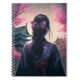 Création informatique d'une geisha dans une forêt de cerisiers en fleurs. Image d'une femme avec une jolie robe et des fleurs dans les cheveux portant un kimono. Le design japonais à la mode AI. En arrière-plan, deux bâtiments japonais.