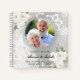 Un arrière - plan élégant à l'aspect faux argent décoré de roses blanches et de dentelle. Ajoutez votre photo, vos noms et la date anniversaire. Les noms sont écrits avec un script de style moderne écrit à la main.