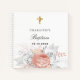 Un arrière - plan blanc chic avec des fleurs roses d'or et de blanc, un feuillage argenté et une croix dorée. Personnalisez et ajoutez un nom et une date.