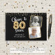 80th Birthday Cheers to 80 Years 2 Photos Livre d'or. Célébrez un 80ème anniversaire avec ce livre d'or, livre de mémoire ou livre d'or personnalisé élégant et festif pour l'invité d'honneur avec le titre design CHEERS TO 80 YEARS avec numéros de ballon d'or faux et typographie de script moderne avec des banderoles d'or et des confettis et lumières blanches, 2 photos et nom dans votre choix de couleur arrière - plan (en noir). ASSISTANCE : Pour obtenir de l'aide sur la modification ou la personnalisation de la conception, le transfert de la conception à un autre produit ou si vous souhaitez coordonner des éléments, contactez le concepteur AVANT de commander par Zazzle Conversation ou par courriel makeitaboutyoustore@gmail.com.