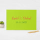 Ce livre d'or mariage est vraiment charmant et unique. Doté d'un arrière - plan vert clair avec une police rose et verte. Le nom du couple est présenté en police cursive rose moderne avec la date mariage en dessous en vert. Customisez votre livre d'hôtes mariage dès aujourd'hui !