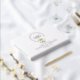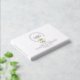 Cet élégant livre d'hôtes en feuille d'or, au design blanc et doré, présente les initiales du couple dans une police manuscrite élégante, encastrée dans un étouffoir décoratif en fil de fer aux délicats accents floraux. Pour une touche d'élégance supplémentaire, le fond du livre d'hôtes est imprimé avec les noms du couple en feuille d'or contre un arrière - plan blanc.