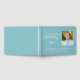 Livre d'or en bleu clair avec texte blanc. En mémoire aimante écrite dans une police de calligraphie blanche. Le livre d'or funéraire comporte un modèle photo où vous pouvez ajouter votre propre photo de votre être cher. Personnalisez en écrivant leur nom et leurs années de vie. L'arrière comprend un motif discret en carreaux de faïence contre un arrière - plan bleu clair.