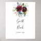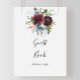 Ce panneau de livre d'or floral bordeaux et de verdure est parfait pour un mariage moderne ou une fête de mariage. Le design élégant boho présente des fleurs de couleur marine aquarelle, rose blush et teinte vin avec des détails artistiques au crayon.