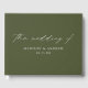 Elégant livre d'or de mariage avec "le mariage de" exposé dans un script moderne de calligraphie blanche sur un arrière - plan vert olive. Personnalisez l'avant du simple livre d'hôtes mariage avec vos noms et votre date de mariage. Le fond du livre d'hôtes vert olive affiche vos initiales monogrammes. Ajoutez votre nom et votre date de mariage à la colonne vertébrale du livre d'or.