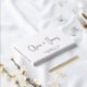Ce livre d'hôtes mariage blanc minimaliste et élégant vous propose le choix de l'or véritable, de l'argent ou de l'or rose, vos prénoms dans un script moderne chic, votre date et votre emplacement mariage dans la typographie serif classique et votre titre personnalisé sur la colonne vertébrale.