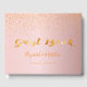 Un livre d'or pour une mariage moderne, élégante et glamour. Arrière - plan chic et poussiéreux en dégradé rose avec confetti doré. Le texte : Guest Book est écrit avec des lettres en faux or tendance. Les noms et la date sont écrits avec un script de style écrit à la main, des lettres d'or. Modèle pour votre texte sur la colonne vertébrale, texte gris.