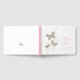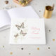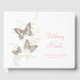 Beaux papillons d'art encré et mariage graphique floral tourbillon livre d'hôtes en rose, crème, aqua turquoise et marron. Personnalisez avec vos propres noms et date mariage. Art dessiné à l'encre de papillon et design graphique par Sarah Trett pour www.mylittleedenweddings.com