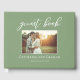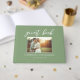 Ce livre d'hôtes simple et solide, vert mariage, avec photo de couple, présente un élégant script blanc pour une cérémonie en plein air dans un cadre naturel. Typographie minimaliste sur un livre d'or vert clair paisible pour un lieu rustique à l'extérieur près d'une forêt d'arbres.
