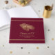 Élégant livre d'hôtes de vacances bordeaux et or, avec des graphiques d'un cône de pin doré et branche de pin. Personnalisez les champs de texte pour votre maison de vacances ou fête de Noël.