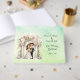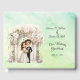 Pour le mariage de notre jardin moins formel, c'est une image mignonne d'une mariée et d'un marié fantaisiste debout à une arche fleurie sur un arrière - plan bleu/vert. Correspond aux invitations de la même conception