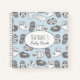 Livre bébé moderne personnalisé avec un motif noir et blanc illustré de différents styles de bottes bébé sur un arrière - plan bleu pastel.