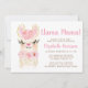 Simple and sweet baby shower invitation featuring a watercolor illustration of a pretty and girly llama with pink florals and gold glitter. "Llama Mama!" and the mother-to-be's name are in a fun pink script and you can personalize whether the shower is for a baby boy or baby girl and other details in gold typography.