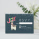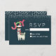 A Christmas RSVP with a whimsical design. A cute llama wearing black sunglasses, a red santa hat, and a festive winter scarf. Also wearing a south american styled blanket and pompoms on his neck. The word Joy written above his head in a festive colourful font. Snow falling down from the top. Set on a dark bluebackground.