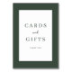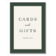 This elegant tabletop sign features a minimalist design with a sophisticated color palette of white and dark green. The text "CARDS and GIFTS" is presented in an understated, classic typography that exudes timeless charm, perfect for expressing gratitude at weddings or other special occasions. The clean layout and simple frame create a refined and welcoming atmosphere, making it ideal for adding a touch of class to your event decor. Its versatile style ensures it complements various wedding themes while maintaining a heartfelt message.