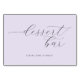 This elegant tabletop sign features a sophisticated script typography that reads "dessert bar" with an inviting phrase below, perfect for adding a touch of charm to your wedding reception. The soft lavender background creates a gentle and romantic atmosphere, complementing the flowing cursive lettering. Ideal for guiding guests to indulge in sweet treats, this design exudes a refined and whimsical mood, enhancing any celebration's ambiance. Its customizable nature allows it to seamlessly fit into various wedding themes, making it a versatile addition to your special day.