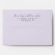 This elegant wedding envelope features a sophisticated and timeless design, perfect for setting the tone for your special day. The soft lavender hue exudes romance and grace, while the flowing script typography adds an air of refinement and personal touch. Ideal for formal occasions, this design captures a classic and romantic mood, making it a beautiful choice to complement any wedding invitation suite. Its clean layout allows for easy customization, ensuring that every detail reflects your unique celebration.