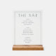 This elegant wedding menu design exudes a modern and sophisticated style, perfect for a chic celebration. Featuring clean typography with a minimalist aesthetic, it lists beverages such as beer, wine, and spirits in an organized layout that conveys simplicity and refinement. The monochromatic color palette enhances its timeless appeal, making it suitable for any formal event. Displayed on a wooden stand, this menu adds a touch of class to your reception table, ensuring guests can easily peruse their drink options while enjoying the ambiance of your special day.