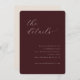 This elegant wedding enclosure card features a sophisticated maroon background with an understated, cursive typography that adds a touch of timeless charm. The design is simple yet refined, focusing on the essential details in a clean and modern layout. Perfect for conveying important information about accommodations and additional wedding details, this card exudes a sense of grace and formality, making it ideal for couples aiming to create a cohesive and polished look for their special day. Its minimalist style ensures it complements any wedding theme while maintaining a focus on clarity and elegance.